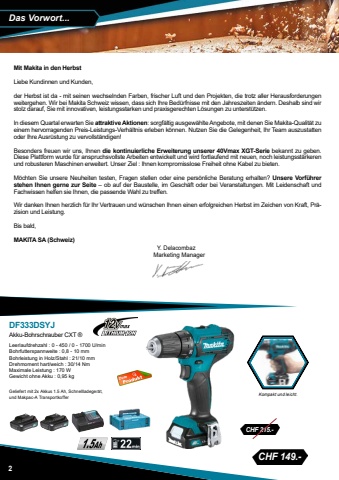 CHF 149.- CHF 215.-Das Vorwort...DF333DSYJAkku-Bohrschrauber CXT %u00aeLeerlaufdrehzahl : 0 - 450 / 0 - 1700 U/minBohrfutterspannweite : 0,8 - 10 mmBohrleistung in Holz/Stahl : 21/10 mmDrehmoment hart/weich : 30/14 NmMaximale Leistung : 170 WGewicht ohne Akku : 0,95 kgGeliefert mit 2x Akkus 1.5 Ah, Schnellladeger%u00e4t, und Makpac-A Transportkoffer Kompakt und leicht.Mit Makita in den HerbstLiebe Kundinnen und Kunden,der Herbst ist da - mit seinen wechselnden Farben, frischer Luft und den Projekten, die trotz aller Herausforderungen weitergehen. Wir bei Makita Schweiz wissen, dass sich Ihre Bed%u00fcrfnisse mit den Jahreszeiten %u00e4ndern. Deshalb sind wir stolz darauf, Sie mit innovativen, leistungsstarken und praxisgerechten L%u00f6sungen zu unterst%u00fctzen.In diesem Quartal erwarten Sie attraktive Aktionen: sorgf%u00e4ltig ausgew%u00e4hlte Angebote, mit denen Sie Makita-Qualit%u00e4t zu einem hervorragenden Preis-Leistungs-Verh%u00e4ltnis erleben k%u00f6nnen. Nutzen Sie die Gelegenheit, Ihr Team auszustatten oder Ihre Ausr%u00fcstung zu vervollst%u00e4ndigen!Besonders freuen wir uns, Ihnen die kontinuierliche Erweiterung unserer 40Vmax XGT-Serie bekannt zu geben. Diese Plattform wurde f%u00fcr anspruchsvollste Arbeiten entwickelt und wird fortlaufend mit neuen, noch leistungsst%u00e4rkeren und robusteren Maschinen erweitert. Unser Ziel : Ihnen kompromisslose Freiheit ohne Kabel zu bieten.M%u00f6chten Sie unsere Neuheiten testen, Fragen stellen oder eine pers%u00f6nliche Beratung erhalten? Unsere Vorf%u00fchrer stehen Ihnen gerne zur Seite %u2013 ob auf der Baustelle, im Gesch%u00e4ft oder bei Veranstaltungen. Mit Leidenschaft und Fachwissen helfen sie Ihnen, die passende Wahl zu treffen.Wir danken Ihnen herzlich f%u00fcr Ihr Vertrauen und w%u00fcnschen Ihnen einen erfolgreichen Herbst im Zeichen von Kraft, Pr%u00e4zision und Leistung.Bis bald,MAKITA SA (Schweiz)  Y. Delacombaz Marketing Manager2