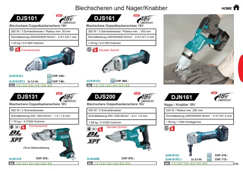 105DJS101DJS101ZJDJS101RTJ 2x 5.0 AhDJS161DJS161ZJDJS131DJS131ZDJS200DJS200ZDJS200Ah Ah 1.5 / 2.0 / 3.0 / 4.0 / 5.0 / 6.0 Ah Ah 1.5 / 2.0 / 3.0 / 4.0 / 5.0 / 6.0 Ah Ah 1.5 / 2.0 / 3.0 / 4.0 / 5.0 / 6.0 Ah Ah 1.5 / 2.0 / 3.0 / 4.0 / 5.0 / 6.0 DJN161ZJDJN161RTJ 2x 5.0 AhDJN161Ah Ah 1.5 / 2.0 / 3.0 / 4.0 / 5.0 / 6.0 Blechscheren und Nager/Knabber HOMEBlechschere Doppelbackenschere 18V 350 W / 3 Schneidmesser / Radius min: 30 mm Schnittleistung 200/400/600 N/mm2 : 2.5/1.0/0.7 mm1.43 kg / 0-4%u2019300 Hub/minBlechschere Doppelbackenschere 18V 350 W / 3 Schneidmesser / Radius min. : 250 mm Schnittleistung 200/400/600 N/mm2 : 2.5/1.6/1.2 mm1.43 kg / 0-4%u2019300 Hub/minBlechschere Doppelbackenschere 18V400 W / 3 Schneidmesser Schnittleistung 400 / 600 N/mm2 : 1.3 / 1.0 mm1.70 kg / 0-3%u2019000 Hub/minBlechschere Doppelbackenschere 18V400 W / 3 SchneidmesserSchnittleistung 400 / 600 N/mm2 : 2.0 / 1.6 mm1.88 kg / 0-3%u2019000 Hub/minFormenschnitt Gerader SchnittFormenschnitt Gerader SchnittNager / Knabber 18V 350 W / Radius min. 250 mm Schnittleistung 200/400/600 N/mm2 : 2.5/1.6/1.2 mm1.60 kg / 1%u2019900 Schl%u00e4ge/minOhne MaterialabtragCHF 749.-CHF 439.-CHF 489.-CHF 579.- CHF 575.- CHF 715.-CHF 479.-