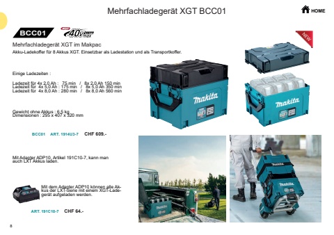 8BCC01BCC01 ART. 1914U3-7ART. 191C10-7Mehrfachladeger%u00e4t XGT BCC01 HOMEMehrfachladeger%u00e4t XGT im MakpacAkku-Ladekoffer f%u00fcr 8 Akkus XGT. Einsetzbar als Ladestation und als Transportkoffer.Gewicht ohne Akkus : 6,5 kgDimensionen : 295 x 407 x 320 mmLadezeit f%u00fcr 4x 2,0 Ah : 75 min / 8x 2,0 Ah 150 minLadezeit f%u00fcr 4x 5,0 Ah : 175 min / 8x 5,0 Ah 350 min Ladezeit f%u00fcr 4x 8,0 Ah : 280 min / 8x 8,0 Ah 560 minEinige Ladezeiten :Mit Adapter ADP10, Artikel 191C10-7, kann man auch LXT Akkus laden.Mit dem Adapter ADP10 k%u00f6nnen alle Ak- kus der LXT-Serie mit einem XGT-Lade- ger%u00e4t aufgeladen werden.CHF 609.-CHF 64.-