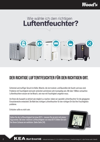 DER RICHTIGE LUFTENTFEUCHTER F%u00dcR DEN RICHTIGEN ORT.Schimmel und muffiger Geruch im Keller, W%u00e4sche, die nie trocknet, und Baustellen die feucht und nass sind. Probleme mit Feuchtigkeit sind weit verbreitet und k%u00f6nnen sehr kostspielig sein. Mit %u00fcber 1 Million verkauften Luftentfeuchtern wissen wir bei Wood%u2018s, wie man mit Feuchtigkeit umgehen muss. Um Ihnen die Auswahl so einfach wie m%u00f6glich zu machen, haben wir spezielle Luftentfeuchter f%u00fcr die g%u00e4ngigsten Einsatzbereiche entwickelt. Die Wahl des richtigen Luftentfeuchter f%u00fcr den richtigen Ort l%u00f6st Ihre Feuchtigkeitsprobleme.Einfacher sollte es nicht sein.Halten Sie die Luftfeuchtigkeit bei etwa 50 % %u2013 messen Sie sie jetzt mit einem Hygrometer. Bei einer relativen Luftfeuchtigkeit von etwa 50 % f%u00fchlen Sie sich ihn Ihrem Zuhause am wohlsten. Siehe Seite (14).2 Industriestrasse 3 | CH-8952 Schlieren | karlernstag.ch | alle Preise exkl. MwSt.