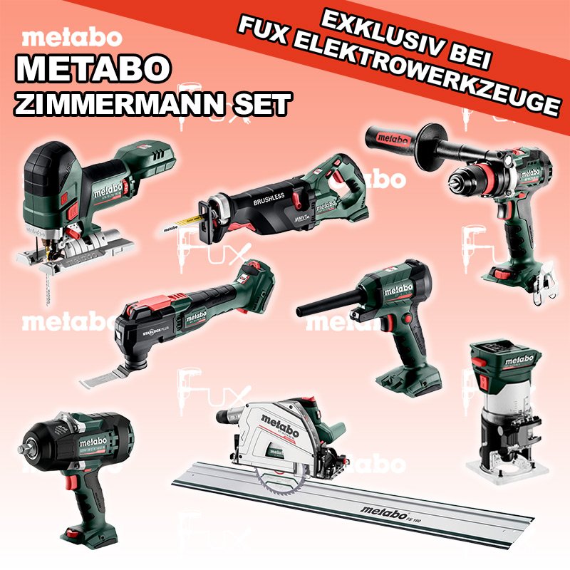 Das Ladenlokal bleibt vom 25. Dezember 2025 bis am 04. Januar 2026 geschlossen. Bestellungen und Lieferungen von Neugeräten werden trotz Ferienabwesenheit in gewohnter Fux-Manier entgegengenommen und ausgeliefert. Heute auf dieses Produkt 31% Rabatt! Zu "Zimmermann Set" von Metabo FULL Service: 36 Monate zum Nulltarif für Sie! Weitere Infos zum FULL Service Dieses Produkt ist CAS kompatibel! Weitere Infos zu CAS David gegen Goliath Aktionen FUX SPECIAL EXKLUSIV BEI FUX Metabo Zimmermann SET XXL SOLO Bestell- und Artikelnummer: Zimmermann SET XXL SOLO BS 18 LTX BL Q I Akku-BohrschrauberAkkuspannung 18 V Drehzahl 0-550 / 0-2000 U/min Drehmoment hart / weich 130 / 65 Nm Gewicht (mit Akkupack) 2.3 kgInfos STA 18 LTX 150 BL Akku-StichsägeAkkuspannung 18 V Hubzahl 1.000-3.500 /min Gewicht ohne Akkupack 1.9 kgInfos MT 18 LTX BL QSL Akku-Multitool Akkuspannung 18 V Schwingzahl bei Leerlauf 8.000 - 20.000 /min Schleifplatte, Maß Eck zu Eck 93 mm Gewicht 1.7 kgInfos SSW 18 LTX 1450 BL Akku-SchlagschrauberAkkuspannung 18 V Anziehdrehmoment 1450 Nm Werkzeugaufnahme 1/2" Infos KS 18 LTX 66 BL Akku HandkreissägeAkkuspannung 18 V Schnitt-Tiefe bei 90° 0-66 mm Sägeblatt 165 mm Gewicht 4.5 kgInfos MS 36-18 LTX BL 40 Akku KettensägeAkkuspannung 18 V Schnittlänge 36 cm Max. Kettengeschwindigkeit 22 m/s Gewicht mit Akkupack 4,6 kgInfos SSEP 18 LTX BL MVT Akku-SäbelsägeAkkuspannung 18 V Hubzahl bei Leerlauf 0 - 3.000 /min Gewicht (mit Akkupack) 4.6 kgInfos BP 18 LTX BL Akku Blaspistole Akkuspannung 18 V Luftmenge 0,7 m 3/min Max. Luftgeschwindigkeit 122 m/sInfos FMV 18 LTX BL 8 Akku Kantenfräse Akkuspannung 18 V Leerlaufdrehzahl 4.800 - 29.000 /min Spannbohrung der Spannzange 6 / 8 mmInfos FS 160 FührungsschieneGesamtlänge 1600 mmInfos Registriere die in diesem Set vorhandenen Metabo Maschinen auf metabo.ch, und ergattere dir bis zu 5 Gratis Akkus!Zusätzlich offerieren wir zu diesem Set einen Gratis Akku!OHNE AKKUS UND LADEGERÄT Standard-Ausrüstung In diesem Set enthalten: BS 18 LTX BL Q I Akku-Bohrschrauber STA 18 LTX 150 BL Akku-Stichsäge MT 18 LTX BL QSL Akku-Multitool SSW 18 LTX 1450 BL Akku-Schlagschrauber KS 18 LTX 66 BL Akku Handkreissäge MS 36-18 LTX BL 40 Akku Kettensäge SSEP 18 LTX BL MVT Akku-Säbelsäge BP 18 LTX BL Akku Blaspistole FMV 18 LTX BL 8 Akku Kantenfräse FS 160 Führungsschiene Listenpreis CHF 3'285.50 Fuxpreis CHF 2'236.00 inkl. 8.1% MwSt, inkl vRG Versand CHF 25.00 Kein Grauimport! Produkt bestellen 1 Stück 2 Stück 3 Stück 4 Stück 5 Stück 6 Stück 7 Stück 8 Stück 9 Stück 10 Stück Alle Angaben ohne Gewähr und solange Vorrat reicht!Wiederverkäufer werden? Produkt als PDF NEUHEITAKTION 31%