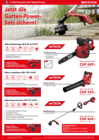 12 Die Ausstattung der Maschinen entspricht der %u00fcblichen Grundausstattung. Technische %u00c4nderungen, Preis%u00e4nderungen und Irrtum vorbehalten. Alle Preise verstehen sich als unverbindliche Preisempfehlung exkl. MwSt. + vRB.Aktion g%u00fcltig bis 31.03.2026Nur solange der Vorrat reicht3 Jahre Garantie ohne RegistrierungBestell-Nr. 535.134%u0083 1x GBL 790 18-ECBestell-Nr. 535.136%u0083 1x GLT 35 18-EC%u0083 Leichtestes Ger%u00e4t seiner Klasse%u0083 Luftmengenregulierung in 3 Stufen mit Boost-Modus%u0083 Schnittgeschwindigkeit in 2 Stufen%u0083 Schnittbreite 30 cm%u0083 Fadenkopf mit \%u0083 Nachstellung der Fadenl%u00e4nge durch Tipp-Automatik%u0083 Faden-Cutter und Spritzschutz%u0083 Gasgebeschalter und DauerbetriebsfunktionAkku-Laubbl%u00e4ser GBL 790 18-ECAkku-Rasentrimmer GLT 35 18-ECJetzt die Garten-PowerSets sichern!%u0083 Leistungsstarke 2 x 18 V Akku-Kettens%u00e4ge %u0083 S%u00e4geschwertl%u00e4nge 35 cm%u0083 Schnitte bis ca. %u00d8 30 cmAkku-Kettens%u00e4ge GCS 35 2x18-ECBestell-Nr. 535.186%u0083 1x GCS 35 2x18-EC%u0083 2x S%u00e4gekette GCS C35 3/8\2 x Passendes Zubeh%u00f6r:Fadenkopf Bestell-Nr. 531.305 CHF 21.- exkl. MwSt.Faden, 5 m Bestell-Nr. 531.304 CHF 11.50 exkl.MwSt.In dieser Aktion zus%u00e4tzlich enthalten:1x Schnellladeger%u00e4t CA 12/182x Akku-Pack Li-Ion AP 18/8.0 AhIn dieser Aktion zus%u00e4tzlich enthalten:1x Schnellladeger%u00e4t CA 12/182x Akku-Pack Li-Ion AP 18/5.0 AhIn dieser Aktion zus%u00e4tzlich enthalten:1x Schnellladeger%u00e4t CA 12/182x Akku-Pack Li-Ion AP 18/5.0 AhAktion statt CHF 628.-CHF 439.-exkl. MwSt. + 2.16 vRBAktion statt CHF 653.-CHF 469.-exkl. MwSt. + 2.16 vRBAktion statt CHF 1'020.- CHF 689.-exkl. MwSt. + 5.51 vRB
