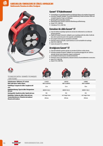 86 WWW.BRENNENSTUHL.COMKABELROLLEN /ENROULEURS DE C%u00c2BLES/ AVVOLGICAVIKabeltrommeln / Enrouleurs de c%u00e2bles/ AvvolgicaviKABELROLLEN /ENROULEURS DE C%u00c2BLES/ AVVOLGICAVIKabeltrommeln / Enrouleurs de c%u00e2bles/ AvvolgicaviKABELROLLEN /ENROULEURS DE C%u00c2BLES/ AVVOLGICAVIKabeltrommeln / Enrouleurs de c%u00e2bles/ AvvolgicaviGarant%u00ae ST Kabeltrommel%u25a0 Trommelk%u00f6rper aus Spezialkunststoff mit verst%u00e4rkenden Rippen auf verzinktem Tragegestell.%u25a0 Innovativer Tragegriff %u201ecablepilot%u201c f%u00fcr perfekte Kabelf%u00fchrung. Pendelt auf beiden Seiten und erm%u00f6glicht bequemes Tragen und Aufh%u00e4ngen.%u25a0 Mit Drehgriff f%u00fcr komfortables Aufrollen.%u25a0 %u00dcberhitzungsschutz, Kontroll-Leuchte bei %u00dcberhitzung und %u00dcberlastung.%u25a0 Stecker T12/3, 230V/10A.%u25a0 4 Steckdosen T13/3, 230V/10A.Enrouleur de c%u00e2ble Garant%u00ae ST%u25a0 Corps du tambour en plastique sp%u00e9cial avec nervures de renforcement sur un ch%u00e2ssis de transport galvanis%u00e9.%u25a0 Poign%u00e9e de transport innovante %u00abcablepilot%u00bb pour un guidage parfait des c%u00e2bles. Oscille des deux c%u00f4t%u00e9s et permet de porter et de suspendre confortablement.%u25a0 Avec poign%u00e9e rotative pour un enroulement confortable.%u25a0 Protection contre la surchauffe, voyant lumineux en cas de surchauffe et de surcharge.%u25a0 Fiche T12/3, 230V/10A.%u25a0 4 prises de courant T13/3, 230V/10A.Avvolgicavo Garant%u00ae ST%u25a0 Corpo del mulinello in plastica speciale con nervature di rinforzo su telaio zincato.%u25a0 Innovativa maniglia di trasporto %u201ccablepilot%u201d per un perfetto passaggio dei cavi. Oscilla su entrambi i lati per essere trasportato e appeso comodamente.%u25a0 Con maniglia di rotazione per un comodo arrotolamento.%u25a0 Protezione contro il surriscaldamento, indicatore luminoso di surriscaldamento e sovraccarico.%u25a0 Spina T12/3, 230V/10A.%u25a0 4 prese T13/3, 230V/10A.TECHNISCHE DATEN / DONN%u00c9ES TECHNIQUES / DATI TECNICIArtikelnummer/ R%u00e9f%u00e9rence / N%u00b0 articolo 1219652 1209102 1209062EAN/ Code-barre / Codice a Barre 4007123301010 4007123300976 4007123300969Kabell%u00e4nge / Longueur de c%u00e2ble / Lunghezza del cavo25 m 33 m 50 mKabelbezeichnung / Type de c%u00e2ble / Designazione del cavo H05VV-F 3G1,5 H05VV-F 3G1,5 H05VV-F 3G1,5Kabelqualit%u00e4t/ Qualit%u00e9 du c%u00e2ble / Qualit%u00e0 del cavo PVC PVC PVCKabelfarbe / Couleur du c%u00e2ble / Colore del cavo rot/ rouge/ rosso rot/ rouge/ rosso rot/ rouge/ rossoTrommeldurchmesser/ Diam%u00e8tre du tambour/ Diametro del tamburo 240 mm 290 mm 290 mm