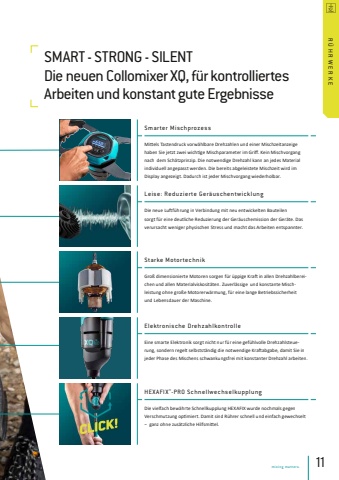 R%u00dcHRWERKEmixing matters.11SMART - STRONG - SILENTDie neuen Collomixer XQ, f%u00fcr kontrolliertes Arbeiten und konstant gute ErgebnisseMittels Tastendruck vorw%u00e4hlbare Drehzahlen und einer Mischzeitanzeige haben Sie jetzt zwei wichtige Mischparameter im Griff. Kein Mischvorgang nach dem Sch%u00e4tzprinzip. Die notwendige Drehzahl kann an jedes Material individuell angepasst werden. Die bereits abgeleistete Mischzeit wird im Display angezeigt. Dadurch ist jeder Mischvorgang wiederholbar.Smarter MischprozessDie neue Luftf%u00fchrung in Verbindung mit neu entwickelten Bauteilen sorgt f%u00fcr eine deutliche Reduzierung der Ger%u00e4uschemission der Ger%u00e4te. Das verursacht weniger physischen Stress und macht das Arbeiten entspannter.Leise: Reduzierte Ger%u00e4uschentwicklungGro%u00df dimensionierte Motoren sorgen f%u00fcr %u00fcppige Kraft in allen Drehzahlbereichen und allen Materialviskosit%u00e4ten. Zuverl%u00e4ssige und konstante Mischleistung ohne gro%u00dfe Motorerw%u00e4rmung, f%u00fcr eine lange Betriebssicherheit und Lebensdauer der Maschine. Starke MotortechnikEine smarte Elektronik sorgt nicht nur f%u00fcr eine gef%u00fchlvolle Drehzahlsteuerung, sondern regelt selbstst%u00e4ndig die notwendige Kraftabgabe, damit Sie in jeder Phase des Mischens schwankungsfrei mit konstanter Drehzahl arbeiten.Elektronische DrehzahlkontrolleDie vielfach bew%u00e4hrte Schnellkupplung HEXAFIX wurde nochmals gegen Verschmutzung optimiert. Damit sind R%u00fchrer schnell und einfach gewechselt %u2212 ganz ohne zus%u00e4tzliche Hilfsmittel.HEXAFIX%u00ae-PRO Schnellwechselkupplung