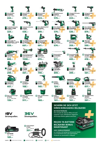 36V - 2,000 WAC/DC Adapter ET36A351.%u201328 mm - 3,2 JBohr-/Mei%u00dfelhammerDH3628DA536.%u201328 mm - 3,2 J - QuickBohr-/Mei%u00dfelhammerDH3628DC574.%u2013824 mmBetonverdichterUV3628DA511.%u2013155/100 NmBohrschrauber DS36DC424.%u2013155/100 NmSchlagbohrschrauberDV36DC436.%u2013%u00d8254 mmPaneels%u00e4geC3610DRA899.%u2013680 m%u00b3/hGebl%u00e4seRB36DA452.%u2013%u00d8254 mmTischkreiss%u00e4geC3610DRJ799.%u20136, 8, 12 mm - 50 mmOberfr%u00e4seM3612DA561.%u201340 mm - 9,2 JBohr-/Mei%u00dfelhammerDH3640DA874.%u20131.900 Nm - 3/4\Schlagschrauber WR36DF574.%u201376 x 533 mmBandschleifer SB3608DA461.%u201335 L/s - HEPA filterNass-/ TrockensaugerRP18DA199.%u2013Max. 159 mmWinkelbohrmasch.D36DYA574.%u201318 m3/min.Ventilator UF18DSAL168.%u201382x2 mmHobel P18DSL349.%u201370/40 NmBohrschrauber DS18DE274.%u201332 mm - 2,500 /min.S%u00e4bels%u00e4geCR18DBL374.%u201355 Nm - QuickBohrschrauberDS18DDQ224.%u20134,000 LumenTripod LightUB18DG399.%u2013Bluetooth - DAB+/FMRadio UR18DA161.%u201311 bar - dual functionKompressor UP18DA199.%u201318 V - 15,7 kgK%u00fchl- und W%u00e4rmebox UL18DBA911.%u201318 VK%u00fchl- und W%u00e4rmebox UL18DF168.%u2013122 m/s - 0,4 kgGebl%u00e4seRA18DA149.%u201355 Nm - 1,3 kgSchlagbohrschrauberDV18DD224.%u201318V - 2,0 AhAkku BSL1820M105.%u2013Stromquellen. Stromquellen.T%u00e4fernagler N1804DA599.%u2013K90 - 13-40 mm230 mmWinkelschleifer G3623DA686.%u2013BGN - 16-50 mmStift Nagler NT1850DA674.%u2013BFN - 25-64 mmStauchkopfnagler NT1865DSA661.%u2013BDA - 36-64 mmStauchkopfnagler NT1865DAA661.%u2013HK20R - 25-35 mmHaftennagler 20%u00b0 NR1890DRA_HAFTE939.%u2013%u00d8125 mmExzenterschleifer SV1813DA224.%u2013140 Nm - 1,2 kgSchlagschrauberWH18DD211.%u2013215 Nm - 1,6 kgSchlagschrauber WH36DC399.%u2013770 Nm - 1/2\Schlagschrauber WR36DE405.%u2013380 Nm - 1/2\Schlagschrauber WR36DH361.%u20131.400 Nm - 1/2\Schlagschrauber WR36DG561.%u20135.000/minTrockenbauschrauberW18DA_OHNE324.%u20135.000/minTrockenbauschrauberW18DA436.%u201318 mm - 1,3 JBohr-/Mei%u00dfelhammerDH18DPA399.%u2013AK34 - 38-64 mmAnkernaglerNR3665DA749.%u201321%u00b0 - 57/45 - 89/77 mmDuplex Nagler NR3675DD856.%u2013DN16 - 25-45 mmDachpappnaglerNV1845DA874.%u2013NP34 - 50-90 mmStreifennagler 34%u00b0NR1890DCA839.%u2013K9 - 6-13 mmKlammernagler N1812DA359.%u20134.1 x 25-90 mmAutomatik Hammer NH18DSL249.%u20137,6 L - 135 psi - 12,4 kgKompressorEC36DA549.%u2013125 mm - SchiebeWinkelschleiferG3613DE349.%u2013127 x 120 mmBands%u00e4geCB3612DA674.%u2013%u00d8150 mm - 57,5 mmMetall-Kreiss%u00e4geCD3605DB430.%u2013Starlock MaxMultitoolCV18DMA349.%u2013Starlock - OISMultitoolCV18DA293.%u2013500-1.200 rpmR%u00fchrger%u00e4t UM36DA374.%u2013297 ml/min - 4,3 kgFettpresse AL18DA459.%u201310-16 mm StahlSchneid-/Biegeger%u00e4t VB3616DA3124.%u20133.000 N - 400 mlKartuschenpistoleAC18DA_400ML405.%u20133.000 N - 600 mlKartuschenpistoleAC18DA_600ML418.%u201330-550%u00b0 CHei%u00dfluftpistoleRH18DA211.%u2013135 mm - StabStichs%u00e4geCJ18DB299.%u2013160 mm - StabStichs%u00e4geCJ36DB461.%u201332 mm - 3.000 /min.S%u00e4bels%u00e4geCR36DA474.%u2013%u00d8165 mm - 66 mmHandkreiss%u00e4geC3606DB486.%u2013%u00d8165 mm - 66 mm - GRHandkreiss%u00e4geC3606DUM536.%u201366 mm - SoftstartTauchkreiss%u00e4geC3606DPA699.%u20136, 8 mmKantenfr%u00e4se M1808DA399.%u20133,5 m3/min.Gebl%u00e4seRB18DC124.%u2013300 mm - 12,6 m/sKettens%u00e4geCS3630DC411.%u2013Asts%u00e4ge CS1810DD217.%u20132,000 LumenBaustellenstrahler UB18DB161.%u20134,000 LumenBaustellenstrahler UB18DC261.%u201310.000 LumenBaustellenstrahlerUB18DD411.%u2013230 LumenLampe UB18DJL74.%u20133200-10000 u/minDachrinnentr%u00e4gereinlassfr%u00e4seG3613DVFRTEFH1590.%u201315-40 mmBetonnaglerNC1840DA914.%u201340-80 mmMagazinschrauberMSC80A_HIKOKI1690.%u201325-51 mmMagazinschrauberMSC50A_HIKOKI1515.%u201385 mmHandkreiss%u00e4geC3609DUM711.%u2013NK20 - 50-90 mmStreifennagler 20%u00b0 NR1890DRA839.%u2013125 mm - SchiebeWinkelschleiferG3613DVE386.%u201318V/MV, USB - 8ASchnellladeger%u00e4tUC18YSL399.%u201318V/MVSchnellladeger%u00e4tUC36YSL2124.%u20134x 18V/MV2x USB, 230V - 8AUC18YTSL255.%u201336/18V - 2,5/5,0 AhAkku Akku_A199.%u201336/18V - 4,0/8,0 AhAkkuAkku_B248.%u201336/18V - 4,0/8,0 AhAkkuBSL3640MVT299.%u20132x BSL36A18X +UC18YSL3Booster_A360.%u20132x BSL36B18X + UC18YSL3Booster_B440.%u2013Stromquellen.Legende: Brushless Motor technology Stapelbarer HSC Koffer Transportkoffer Karton Bonusakku-AktionRE%u00c7OIS TA BATTERIE BSL36A18X BONUS MAINTENANTAVEC ENREGISTREMENTLe nombre de batteries bonus est limit%u00e9 %u00e0 un maximum de 5 par participant.Produits en promotion indiqu%u00e9sSICHERN SIE SICH JETZT IHREN BONUSAKKU BSL36A18XBEI REGISTRIERUNGDie Anzahl der Bonus-Akkus ist auf maximal 5 pro Teilnehmer begrenzt.Aktionsprodukte gekennzeichnet6,8 J - 2.880/minBohr-/MeisselhammerH3641DA586.%u2013