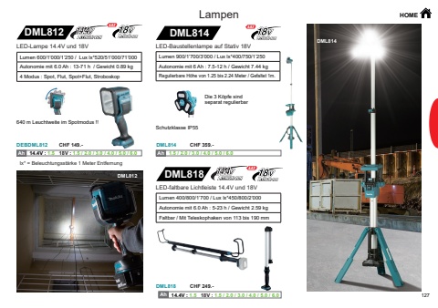 127DML812DEBDML812DML818DML818DML814DML814DML812DML814Ah Ah 14.4V : 1.5 18V : 1.5 / 2.0 / 3.0 / 4.0 / 5.0 / 6.0 Ah Ah 1.5 / 2.0 / 3.0 / 4.0 / 5.0 / 6.0 Ah Ah 14.4V : 1.5 18V : 1.5 / 2.0 / 3.0 / 4.0 / 5.0 / 6.0Lampen HOMELED-Lampe 14.4V und 18VLumen 600/1%u2019000/1%u2019250 / Lux lx*520/51%u2019000/71%u2019000Autonomie mit 6.0 Ah : 13-71 h / Gewicht 0.89 kg4 Modus : Spot, Flut, Spot+Flut, StroboskopLumen 400/800/1%u2019700 / Lux lx*450/800/2%u2019000Autonomie mit 6.0 Ah : 5-23 h / Gewicht 2.59 kgFaltbar / Mit Teleskophaken von 113 bis 190 mmLED-faltbare Lichtleiste 14.4V und 18VLED-Baustellenlampe auf Stativ 18VLumen 900/1%u2019700/3%u2019000 / Lux lx*400/750/1%u2019250 Autonomie mit 6 Ah : 7.5-12 h / Gewicht 7.44 kgRegulierbare H%u00f6he von 1.25 bis 2.24 Meter / Gefaltet 1m. Die 3 K%u00f6pfe sind separat regulierbarSchutzklasse IP55640 m Leuchtweite im Spotmodus !! lx* = Beleuchtungsst%u00e4rke 1 Meter EntfernungCHF 149.-CHF 249.-CHF 359.-