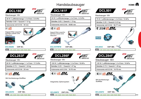 131DCL180DCL180ZBDCL181FDCL181FRFWDCL501DCL501ZAh Ah 1.5 / 2.0 / 3.0 / 4.0 / 5.0 / 6.0 Ah Ah 1.5 / 2.0 / 3.0 / 4.0 / 5.0 / 6.0 Ah Ah 1.5 / 2.0 / 3.0 / 4.0 / 5.0 / 6.0 DCL286FDCL286FZDCL284FDCL284FZDCL283FDCL283FZAh Ah 1.5 / 2.0 / 3.0 / 4.0 / 5.0 / 6.0 Ah Ah 1.5 / 2.0 / 3.0 / 4.0 / 5.0 / 6.0 Ah Ah 1.5 / 2.0 / 3.0 / 4.0 / 5.0 / 6.0 Handstaubsauger HOME30 W / Luftf%u00f6rdermenge 1.4 m3/min / 3.6 kPa Beh%u00e4lter 0.65 l / Gewicht 1.12 kg Autonomie mit 6.0 Ah : 40 min Staubsauger 18VKapsel-Filter sorgt f%u00fcrleichtes Leeren undWaschenStaubsauger 18V30 W / Luftf%u00f6rdermenge 1.4 m3/min / 4.2 kPaBeh%u00e4lter 0.65 l / Gewicht 1.13 kgAutonomie mit 6.0 Ah : 40/80 min Kapsel-Filter sorgt f%u00fcr leichtes Leeren und WaschenStaubsauger 18V75 W / Luftf%u00f6rdermenge 1.2 m3/min / 10 kPa Beh%u00e4lter 0.25 l / Gewicht 3.23 kgAutonomie mit 6.0 Ah : 35-77 min Integriertes ZyklonsystemStaubsauger 18V100 W / Luftf%u00f6rdermenge 1.0 m3/min / 18 kPa Beh%u00e4lter 0.25 l / Gewicht 1.47 kgAutonomie mit 6.0 Ah : 16-76 minStaubsauger 18V125 W / Luftf%u00f6rdermenge 1.2 m3/min / 18 kPa Beh%u00e4lter 0.73 l / Gewicht 1.25 kgAutonomie mit 6.0 Ah : 16-76 min Mit HochleistungsStofffilterStaubsauger 18V90 W / Luftf%u00f6rdermenge 1.1 m3/min / 17.5 kPa Beh%u00e4lter 0.73 l / Gewicht 1.24 kg Autonomie mit 6.0 Ah : 20 minMit Hochleistungs-StofffilterStaubsaugerCHF 85.- CHF 209.- CHF 465.-CHF 195.- CHF 219.- CHF 195.-