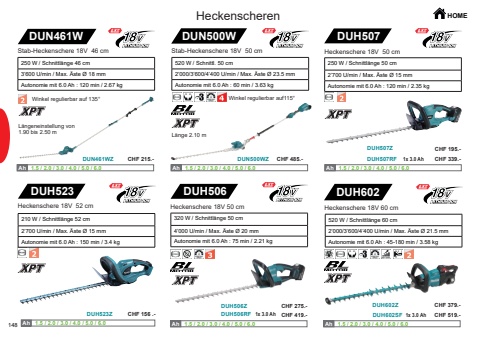 148DUH506DUH506RFDUH506Z1x 3.0 AhDUH507DUH507ZDUH507RF 1x 3.0 AhDUH523DUH523ZDUH602DUH602SFDUH602Z1x 3.0 AhAh Ah 1.5 / 2.0 / 3.0 / 4.0 / 5.0 / 6.0 Ah Ah 1.5 / 2.0 / 3.0 / 4.0 / 5.0 / 6.0 Ah Ah 1.5 / 2.0 / 3.0 / 4.0 / 5.0 / 6.0 Ah Ah 1.5 / 2.0 / 3.0 / 4.0 / 5.0 / 6.0 DUN461WZ DUN500WZDUN461W DUN500WAh Ah 1.5 / 2.0 / 3.0 / 4.0 / 5.0 / 6.0 Ah Ah 1.5 / 2.0 / 3.0 / 4.0 / 5.0 / 6.0 HOME320 W / Schnittl%u00e4nge 50 cm4%u2019000 U/min / Max. %u00c4ste %u00d8 20 mmAutonomie mit 6.0 Ah : 75 min / 2.21 kgHeckenschere 18V 50 cm250 W / Schnittl%u00e4nge 50 cm2%u2019700 U/min / Max. %u00c4ste %u00d8 15 mm Autonomie mit 6.0 Ah : 120 min / 2.35 kg Heckenschere 18V 50 cm210 W / Schnittl%u00e4nge 52 cm2%u2019700 U/min / Max. %u00c4ste %u00d8 15 mmAutonomie mit 6.0 Ah : 150 min / 3.4 kg Heckenschere 18V 52 cm Heckenschere 18V 60 cm520 W / Schnittl%u00e4nge 60 cm 2%u2019000/3%u2019600/4%u2019400 U/min / Max. %u00c4ste %u00d8 21.5 mmAutonomie mit 6.0 Ah : 45-180 min / 3.58 kgHeckenscherenStab-Heckenschere 18V 50 cm520 W / Schnittl. 50 cm2%u2019000/3%u2019600/4%u2019400 U/min / Max. %u00c4ste %u00d8 23.5 mmAutonomie mit 6.0 Ah : 60 min / 3.63 kgStab-Heckenschere 18V 46 cm250 W / Schnittl%u00e4nge 46 cm3%u2019600 U/min / Max. %u00c4ste %u00d8 18 mmAutonomie mit 6.0 Ah : 120 min / 2.67 kgWinkel regulierbar auf115%u00b0L%u00e4ngeneinstellung von1.90 bis 2.50 mWinkel regulierbar auf 135%u00b0L%u00e4nge 2.10 mCHF 419.-CHF 275.-CHF 195.-CHF 339.-CHF 156 .-CHF 379.-CHF 519.-CHF 215.- CHF 485.-