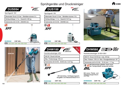 150DUS054DUS054ZDUS158DUS158ZDHW080Ah Ah 1.5 / 2.0 / 3.0 / 4.0 / 5.0 / 6.0 Ah Ah 1.5 / 2.0 / 3.0 / 4.0 / 5.0 / 6.0 DHW180ZDHW180Ah Ah 1.5 / 2.0 / 3.0 / 4.0 / 5.0 / 6.0 DHW080ZKDHW080Ah Ah 1.5 / 2.0 / 3.0 / 4.0 / 5.0 / 6.0 DHW180Spr%u00fchger%u00e4te und Druckreiniger HOMESpr%u00fchger%u00e4t 18VMaximaler Druck 3.0 bar / Beh%u00e4ltervolumen 5 L Schlauchl%u00e4nge 1.7 m / Gewicht 2.85 kgAutonomie mit 3.0 Ah : 230/240 minSpr%u00fchger%u00e4t 18VMaximaler Druck 5.0 bar / Beh%u00e4ltervolumen 15 L Schlauchl%u00e4nge 1.7 m / Gewicht 5.81 kgAutonomie mit 5.0 Ah : 335/460 minHochdruckreiniger 40V250 W / Druck 8-24 barMax. F%u00f6rdermenge 150 L/h Autonomie mit 6.0 Ah : 30-83 min / 5.27 kgMit Variod%u00fcse, Verl%u00e4ngerungsrohr, Saugfilter und Wasserschlauch 6 m800 W / Druck 30-55 bar / max. 80 bar Max. F%u00f6rderm. 378 L/h / Max. Fl%u00fcssigkeitstemper. 40%u00b0Autonomie mit 2x 6.0 Ah : 15-34 min / 7.7 kgHochdruckreiniger 2x18V=36VMit Wassertank geliefert. Kann auch als Transportkiste verwendet werdenMit Lanze, Pistole und Selbstansaugschlauch mit FilterCHF 245.- CHF 389.-CHF 149.- CHF 715.-