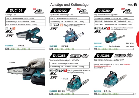 151DUC101DUC101ZDUC122 DUC254DUC122Z DUC254CZDUC254ZAh Ah 1.5 / 2.0 / 3.0 / 4.0 / 5.0 / 6.0 Ah Ah 1.5 / 2.0 / 3.0 / 4.0 / 5.0 / 6.0 Ah Ah 1.5 / 2.0 / 3.0 / 4.0 / 5.0 / 6.0 DUC256DUC256ZDUC306DUC306Z= 30 cm3Ah Ah 1.5 / 2.0 / 3.0 / 4.0 / 5.0 / 6.0 Ah Ah 1.5 / 2.0 / 3.0 / 4.0 / 5.0 / 6.0 DUC101HOMEAsts%u00e4ge 18V320 W / Schienenl%u00e4nge 10 cm / 8 m/sKettenteilung 0.325\420 Schnitte %u00d8 50 mm mit 6.0 Ah / 1.17 kg Nur f%u00fcr gewerbliche Anwender mit Spezialausbildung430 W / Schnittl%u00e4nge 11.5 cm / 5 m/sKettenteilung 1/4\Top-Handle Kettens%u00e4ge 18V570 W / Schnittl%u00e4nge 25 cm / 24 m/s / 2.33 kgDUC254Z : Kettenteilung 3/8\DUC254CZ : Kettenteilung 1/4\*Carving VersionTop-Handle Kettens%u00e4ge 18VNur f%u00fcr gewerbliche Anwender mit SpezialausbildungAsts%u00e4ge und Kettens%u00e4ge1%u2019200 W / Schnittl%u00e4nge 25 cm / 20 m/sKettenteilung 3/8\Top-Handle Kettens%u00e4ge 2x18V=36VNur f%u00fcr gewerbliche Anwender mit SpezialausbildungTop-Handle Kettens%u00e4ge 2x18V=36VGleiche Maschine wie die DUC256, aber mit einer Schnittl%u00e4nge von 30 cm Gewicht 3.20 kgCHF 225.- CHF 245.-CHF 379.-CHF 455.-CHF 399.- CHF 419.-