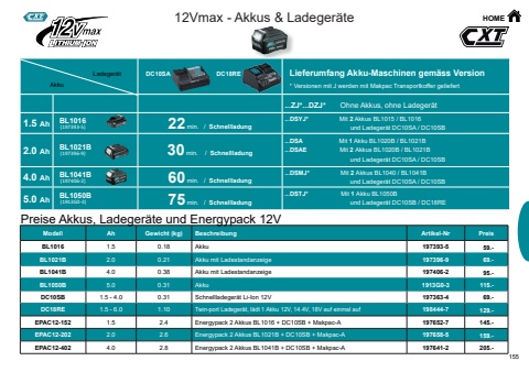 155HOMEModell Ah Gewicht (kg) Beschreibung Artikel-Nr PreisBL1016 1.5 0.18 Akku 197393-5BL1021B 2.0 0.21 Akku mit Ladestandanzeige 197396-9BL1041B 4.0 0.38 Akku mit Ladestandanzeige 197406-2BL1050B 5.0 0.31 Akku 1913G0-3DC10SB 1.5 - 4.0 0.31 Schnellladeger%u00e4t Li-Ion 12V 197363-4DC18RE 1.5 - 6.0 1.10 Twin-port Ladeger%u00e4t, l%u00e4dt 1 Akku 12V, 14.4V, 18V auf einmal auf 198444-7EPAC12-152 1.5 2.4 Energypack 2 Akkus BL1016 + DC10SB + Makpac-A 197652-7EPAC12-202 2.0 2.6 Energypack 2 Akkus BL1021B + DC10SB + Makpac-A 197658-5EPAC12-402 4.0 2.8 Energypack 2 Akkus BL1041B + DC10SB + Makpac-A 197641-2Lieferumfang Akku-Maschinen gem%u00e4ss Version* Versionen mit J werden mit Makpac Transportkoffer geliefert...ZJ*...DZJ* Ohne Akkus, ohne Ladeger%u00e4t1.5 Ah BL1016 (197393-5) 22 min. / Schnellladung...DSYJ* Mit 2 Akkus BL1015 / BL1016 und Ladeger%u00e4t DC10SA / DC10SB 2.0 Ah BL1021B (197396-9) 30 min. / Schnellladung...DSA Mit 1 Akku BL1020B / BL1021B...DSAE Mit 2 Akkus BL1020B / BL1021B und Ladeger%u00e4t DC10SA / DC10SB 4.0 Ah BL1041B (197406-2) 60 min. / Schnellladung...DSMJ* Mit 2 Akkus BL1040 / BL1041B und Ladeger%u00e4t DC10SA / DC10SB5.0 Ah BL1050B (1913G0-3) 75 min. / Schnellladung...DSTJ* Mit 1 Akku BL1050B und Ladeger%u00e4t DC10SB / DC18REAkkuLadeger%u00e4t DC10SA DC18RE12Vmax - Akkus & Ladeger%u00e4tePreise Akkus, Ladeger%u00e4te und Energypack 12V59.-69.-95.-115.-69.-129.-145.-159.-205.-