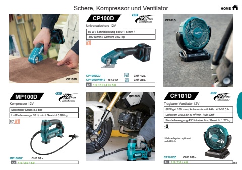 161CP100D1x 4.0 AhCP100DZJCP100D CP100DWM1JAh Ah 1.5 / 2.0 / 4.0 / 5.0 MP100DZMP100DAh Ah 1.5 / 2.0 / 4.0 MP100D CF101DCF101DZAh Ah 1.5 / 2.0 / 4.0 CF101DSchere, Kompressor und Ventilator HOMEUniversalschere 12V80 W / Schnittleistung bei 0%u00b0 : 6 mm / 300 U/min / Gewicht 0.52 kg Kompressor 12VMaximaler Druck 8.3 barLuftf%u00f6rdermenge 10 l / min / Gewicht 0.98 kgTragbarer Ventilator 12V%u00d8 Fl%u00fcgel 180 mm / Autonomie mit 4Ah : 4.5-10.5 hLuftstrom 3.0/3.8/4.6 m3/min / Mit GriffPendelbewegung 45%u00b0 links/rechts / Gewicht 1.27 kgNetzadapter optional erh%u00e4ltlichCHF 285.-CHF 125.-CHF 99.- CHF 109.-