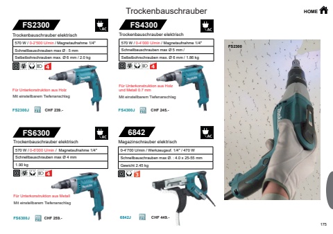 17568426842JFS2300FS2300JFS4300FS6300FS4300JFS6300JFS2300CHF 449.-CHF 239.- CHF 245.-CHF 259.-Trockenbauschrauber HOME0-4%u2019700 U/min / Werkzeugauf. 1/4\Schnellbauschrauben max %u00d8. : 4.0 x 25-55 mm Gewicht 2.45 kgMagazinschrauber elektrischMit einstellbarem Tiefenanschlag570 W / 0-2%u2019500 U/min / Magnetaufnahme 1/4\Schnellbauschrauben max %u00d8 : 5 mm Selbstbohrschrauben max. %u00d8 6 mm / 2.0 kgTrockenbauschrauber elektrisch570 W / 0-4%u2019000 U/min / Magnetaufnahme 1/4\Schnellbauschrauben max %u00d8 5 mm / Selbstbohrschrauben max. %u00d8 6 mm / 1.86 kgTrockenbauschrauber elektrisch570 W / 0-6%u2019000 U/min / Magnetaufnahme 1/4\Schnellbauschrauben max %u00d8 4 mm1.90 kgTrockenbauschrauber elektrischMit einstellbarem TiefenanschlagMit einstellbarem TiefenanschlagF%u00fcr Unterkonstruktion aus HolzF%u00fcr Unterkonstruktion aus Holzund Metall 0.7 mmF%u00fcr Unterkonstruktion aus Metall