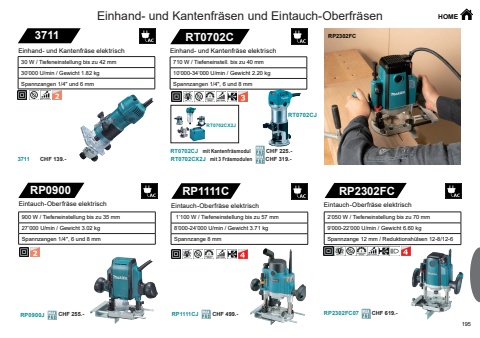 195RP0900RP0900J RP1111CJ RP2302FC07RP1111C RP2302FC37113711 RT0702CRT0702CJRT0702CX2JRT0702CX2JRT0702CJRP2302FCCHF 255.- CHF 499.- CHF 619.-CHF 139.-CHF 225.-CHF 319.-HOMEEintauch-Oberfr%u00e4se elektrisch Eintauch-Oberfr%u00e4se elektrisch900 W / Tiefeneinstellung bis zu 35 mm27%u2019000 U/min / Gewicht 3.02 kgSpannzangen 1/4\ 1%u2019100 W / Tiefeneinstellung bis zu 57 mm8%u2019000-24%u2019000 U/min / Gewicht 3.71 kgSpannzange 8 mm 2%u2019050 W / Tiefeneinstellung bis zu 70 mm9%u2019000-22%u2019000 U/min / Gewicht 6.60 kgSpannzange 12 mm / Reduktionsh%u00fclsen 12-8/12-6 Eintauch-Oberfr%u00e4se elektrischEinhand- und Kantenfr%u00e4sen und Eintauch-Oberfr%u00e4senEinhand- und Kantenfr%u00e4se elektrisch30 W / Tiefeneinstellung bis zu 42 mm30%u2019000 U/min / Gewicht 1.82 kgSpannzangen 1/4\Einhand- und Kantenfr%u00e4se elektrisch710 W / Tiefeneinstell. bis zu 40 mm10%u2019000-34%u2019000 U/min / Gewicht 2.20 kgSpannzangen 1/4\mit Kantenfr%u00e4smodul mit 3 Fr%u00e4smodulen Kantenfr%u00e4sen und Oberfr%u00e4sen