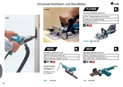 196PJ7000 PJ7000PJ7000J90319031903290329032CHF 445.-CHF 225.- CHF 309.-Universal-Nutfr%u00e4sen und Bandfeilen HOMEUniversal-Nutfr%u00e4se elektrisch700 W / Tiefeneinstellung bis zu 20 mm11%u2019000 U/min / Gewicht 3.20 kg S%u00e4geblatt %u00d8 100 mmBandfeile elektrisch 30 mm500 W / Schleifband 30x533 mm200-1%u2019000 U/min / Gewicht 2.36 kgSonder-Zubeh%u00f6r :Schleifarm 6 mmArt. 125157-7Schleifarm 13 mmArt. 125159-3Bandfeile elektrisch 9 mm500 W / Schleifband 9x533 mm300-1%u2019700 U/min / Gewicht 1.81 kg