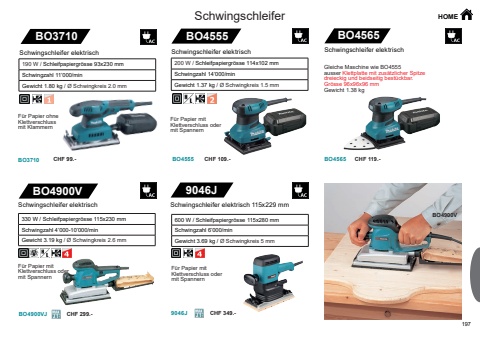 197BO4900VJBO4900V 9046J9046JBO3710BO3710BO4555 BO4565BO4555 BO4565BO4900VCHF 299.- CHF 349.-CHF 99.- CHF 109.- CHF 119.-HOMESchwingschleifer elektrisch 330 W / Schleifpapiergr%u00f6sse 115x230 mmSchwingzahl 4%u2019000-10%u2019000/minGewicht 3.19 kg / %u00d8 Schwingkreis 2.6 mmSchwingschleifer elektrisch 115x229 mm600 W / Schleifpapiergr%u00f6sse 115x280 mmSchwingzahl 6%u2019000/minGewicht 3.69 kg / %u00d8 Schwingkreis 5 mmF%u00fcr Papier mit Klettverschluss odermit SpannernF%u00fcr Papier ohne Klettverschluss mit KlammernSchwingschleifer elektrisch190 W / Schleifpapiergr%u00f6sse 93x230 mmSchwingzahl 11%u2019000/minGewicht 1.80 kg / %u00d8 Schwingkreis 2.0 mmSchwingschleifer elektrisch Schwingschleifer elektrisch200 W / Schleifpapiergr%u00f6sse 114x102 mmSchwingzahl 14%u2019000/minGewicht 1.37 kg / %u00d8 Schwingkreis 1.5 mmSchwingschleiferGleiche Maschine wie BO4555ausser Klettplatte mit zus%u00e4tzlicher Spitze dreieckig und beidseitig best%u00fcckbar. Gr%u00f6sse 96x96x96 mm Gewicht 1.38 kgF%u00fcr Papier mit Klettverschluss odermit SpannernF%u00fcr Papier mit Klettverschluss odermit SpannernSchleifer & Multifunk- tionswerkzeuge