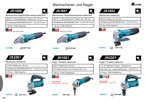 208JS1000 JS1601 JS1602JS3201JS1000J JS1601J JS1602JJS3201JJN1601JN1601JN3201JN3201JCHF 449.- CHF 465.-CHF 519.-CHF 479.-CHF 429.- CHF 589.-HOME380 W / Radius min. 30 mmSchnittleistung 200/400/600/800 N/mm2 : 2.5/1.6/1.2/0.8 mm2.0 kg / 4%u2019000 H%u00fcbe/min Blechschere Doppelbackenschere elektrisch Blechschere elektrisch380 W / 3 Schneidmesser / Radius min. 30 mm Schnittleistung 200/400/600/800 N/mm2 : 2.5/1.0/0.7/0.5 mm1.80 kg / 4%u2019500 H%u00fcbe/min Blechschere Doppelbackenschere elektrisch710 W / Radius min. 50 mmSchnittleistung 200/400/600/800 N/mm2 : 4.0/3.2/2.5/1.5 mm3.85 kg / 1%u2019600 H%u00fcbe/minBlechschere elektrisch380 W / 3 Schneidmesser / Radius min. 250 mmSchnittleistung 200/400/600/800 N/mm2 : 2.5/1.6/1.2/0.8 mm1.80 kg / 4%u2019500 H%u00fcbe/min Blechscheren und NagerFormenschnitt Gerader Schnitt710 W / Radius inn./auss. : 120/128 mmSpurbreite 8 mm / Leistung Stahl/Inox/Alu. : 3.2/2.5/3.5 mm3.76 kg / 1%u2019600 Schl%u00e4ge/minNager / Knabber elektrischWeichstahl400 N/mm2 : 1.6 mmNager / Knabber elektrisch550 W / Radius min. 45 mmSchneidspurbreite 5 mm/ Eintauch %u00d8 22 mm1.85 kg / 2%u2019200 Schl%u00e4ge/minWeichstahl400 N/mm2 : 3.2 mm