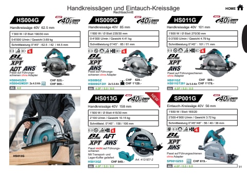 HOME31HS013GHS013GZAh Ah 4.0F / 5.0 / 8.0 SP001GSP001GZ03Ah Ah 4.0F / 5.0 / 8.0 HS004GHS004GM201HS004GZ032x 4.0 AhHS011GZHS011GT201HS011GHS009GZHS009GT201HS009G2x 5.0 Ah 2x 5.0 AhAh Ah 4.0 Ah Ah 4.0F / 5.0 / 8.0 Ah Ah 4.0F / 5.0 / 8.0 HS013GArt. 4131E7-2Handkreiss%u00e4ge 40V 158 mm1%u2019500 W / %u00d8 Blatt 415/30 mm2%u2019100 U/min / Gewicht 10.15 kgSchnittleist. 0%u00b0/45%u00b0 : 158 / 106 mmHandkreiss%u00e4gen und Eintauch-Kreiss%u00e4ge RechtsschnittEintauch-Kreiss%u00e4ge 40V 56 mm1%u2019650 W / Blatt 165/202%u2019500-4%u2019900 U/min / Gewicht 3.72 kgSchnittleistung 0%u00b0/45%u00b0/48%u00b0 : 56 / 40 / 38 mmPasst auf F%u00fchrungsschienenohne Adapter1%u2019300 W / %u00d8 Blatt 190/30 mm0-6%u2019000 U/min / Gewicht 3.69 kgSchnittleistung 0%u00b0/45%u00b0 : 62.5 / 42 / 44.5 mmHandkreiss%u00e4ge 40V 62.5 mmPasst auf F%u00fchrungsschienen ohne Adapter1%u2019600 W / %u00d8 Blatt 270/30 mm0-3%u2019500 U/min / Gewicht 4.79 kgSchnittleistung 0%u00b0/45%u00b0 : 101 / 71 mmHandkreiss%u00e4ge 40V 101 mm1%u2019600 W / %u00d8 Blatt 235/30 mm0-4%u2019000 U/min / Gewicht 4.41 kgSchnittleistung 0%u00b0/45%u00b0 : 85 / 61 mmHandkreiss%u00e4ge 40V 85 mmPasst auf F%u00fchrungsschienenohne AdapterPasst auf F%u00fchrungsschienen ohne AdapterPasst nicht auf F%u00fchrungsschienenMit Transport- und Lager-Koffer geliefertCHF 849.- CHF 619.-CHF 525.-CHF 989.-CHF 529.-CHF 1%u2019129.-CHF 589.- CHF 1%u2019179.-