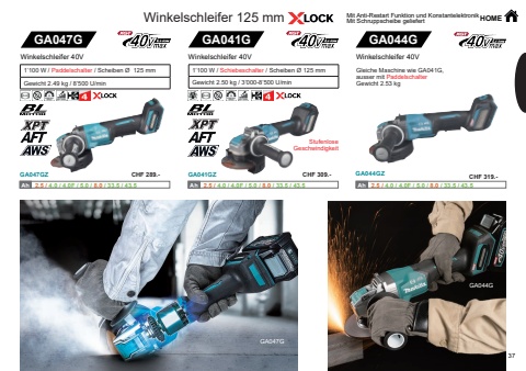 HOME37GA041GZGA041GGA044GZGA044GGA047GZGA047GAh Ah 2.5 / 4.0 / 4.0F / 5.0 / 8.0 / 33.5 / 43.5 Ah Ah 2.5 / 4.0 / 4.0F / 5.0 / 8.0 / 33.5 / 43.5 Ah Ah 2.5 / 4.0 / 4.0F / 5.0 / 8.0 / 33.5 / 43.5GA047GGA044GWinkelschleifer 125 mm Mit Anti-Restart Funktion und KonstantelektronikMit Schruppscheibe geliefert1%u2019100 W / Schiebeschalter / Scheiben %u00d8 125 mmGewicht 2.50 kg / 3%u2019000-8%u2019500 U/minWinkelschleifer 40V StufenloseGeschwindigkeitWinkelschleifer 40V Winkelschleifer 40V 1%u2019100 W / Paddelschalter / Scheiben %u00d8 125 mmGewicht 2.49 kg / 8%u2019500 U/minGleiche Maschine wie GA041G, ausser mit Paddelschalter Gewicht 2.53 kgCHF 289.- CHF 309.- CHF 319.-