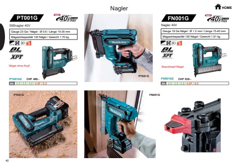 HOME42PT001GPT001GZAh Ah 2.0 / 2.5 / 4.0 / 4.0F / 5.0FN001GFN001GZAh Ah 2.0 / 2.5 / 4.0 / 4.0F / 5.0PT001GPT001G FN001GStiftnagler 40VGauge 23 Ga / N%u00e4gel : %u00d8 0.6 / L%u00e4nge 15-35 mmMagazinkapazit%u00e4t 120 N%u00e4gel / Gewicht 1.70 kgNaglerNagler 40VGauge 18 Ga N%u00e4gel : %u00d8 1.2 mm / L%u00e4nge 15-40 mm Magazinkapazit%u00e4t 100 N%u00e4gel / Gewicht 1.91 kgN%u00e4gel ohne Kopf Stauchkopf-N%u00e4gelCHF 469.- CHF 539.-