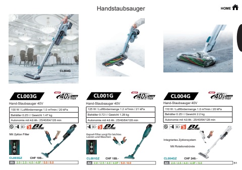 HOME51CL001GCL001GZCL003GCL003GZAh Ah 2.0 / 2.5 / 4.0 / 4.0F / 5.0 / 8.0 Ah Ah 2.0 / 2.5 / 4.0 / 4.0F / 5.0 / 8.0 CL004GCL004GZAh Ah 2.0 / 2.5 / 4.0 / 4.0F / 5.0CL004GHandstaubsaugerHand-Staubsauger 40V125 W / Luftf%u00f6rdermenge 1.2 m%u00b3/min / 21 kPaBeh%u00e4lter 0.72 l / Gewicht 1.28 kgAutonomie mit 4.0 Ah : 25/40/64/128 min Kapsel-Filter sorgt f%u00fcr leichtes Leeren und WaschenHand-Staubsauger 40V100 W / Luftf%u00f6rdermenge 1.0 m%u00b3/min / 20 kPaBeh%u00e4lter 0.25 l / Gewicht 1.47 kgAutonomie mit 4.0 Ah : 25/40/64/128 min Mit Zyklon Filter110 W / Luftf%u00f6rdermenge 1.0 m%u00b3/min / 20 kPaBeh%u00e4lter 0.25 l / Gewicht 2.2 kgAutonomie mit 4.0 Ah : 25/40/64/128 min Hand-Staubsauger 40VIntegriertes ZyklonsystemMit Rotationsb%u00fcrsteStaubsaugerCHF 199.- CHF 189.- CHF 249.-