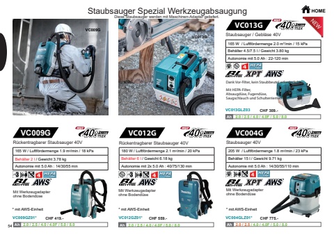 HOME54VC004GVC004GLZ01*VC009GVC009GZ01*VC012GVC012GZ01*Ah Ah 2.0 / 2.5 / 4.0 / 4.0F / 5.0 / 8.0 Ah Ah 2.0 / 2.5 / 4.0 / 4.0F / 5.0 / 8.0 Ah Ah 2.0 / 2.5 / 4.0 / 4.0F / 5.0 / 8.0 VC009GVC013GVC013GVC013GLZ03Ah Ah 2.0 / 2.5 / 4.0 / 4.0F / 5.0 / 8.0 205 W / Luftf%u00f6rdermenge 1.8 m3/min / 23 kPaBeh%u00e4lter 15 l / Gewicht 9.71 kgAutonomie mit 5.0 Ah : 14/30/55/110 min Staubsauger 40V165 W / Luftf%u00f6rdermenge 1.9 m3/min / 18 kPa Beh%u00e4lter 2 l / Gewicht 3.78 kgAutonomie mit 5.0 Ah : 14/30/55 min R%u00fcckentragbarer Staubsauger 40VMit Werkzeugadapterohne Bodend%u00fcseR%u00fcckentragbarer Staubsauger 40V180 W / Luftf%u00f6rdermenge 2.1 m3/min / 20 kPaBeh%u00e4lter 6 l / Gewicht 6.18 kgAutonomie mit 2x 5.0 Ah : 40/75/130 min Staubsauger Spezial WerkzeugabsaugungMit Werkzeugadapterohne Bodend%u00fcseMit Werkzeugadapterohne Bodend%u00fcse* mit AWS-Einheit * mit AWS-Einheit * mit AWS-Einheit Diese Staubsauger werden mit Maschinen-Adapter geliefert.165 W / Luftf%u00f6rdermenge 2.0 m3/min / 15 kPaBeh%u00e4lter 4.5/7.5 l / Gewicht 3.80 kgAutonomie mit 5.0 Ah : 22-120 min Staubsauger / Gebl%u00e4se 40VDank Vor-Filter, kein Staubbeutel erforderlichMit HEPA-Filter,Absaugd%u00fcse, Fugend%u00fcse, Saugschlauch und SchulterriemenCHF 419.- CHF 559.- CHF 775.-CHF 309.-