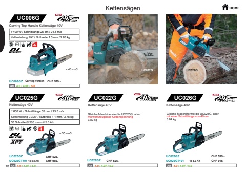 HOME70UC025GUC025GZUC025GT101 1x 5.0 AhUC026GUC026GZUC026GT101 1x 5.0 AhUC022GUC022GZ= 35 cm3Ah Ah 4.0 / 4.0F / 5.0 Ah Ah 4.0 / 4.0F / 5.0 Ah Ah 4.0 / 4.0F / 5.0UC006GUC006GZ= 40 cm3Ah Ah 4.0 / 4.0F / 5.0UC022G UC026GKettens%u00e4genKettens%u00e4ge 40V1%u2019600 W / Schnittl%u00e4nge 35 cm / 25.5 m/sKettenteilung 0.325\35 Schnitte %u00d8 300 mm mit 5.0 AhKettens%u00e4ge 40V Kettens%u00e4ge 40VGleiche Maschine wie die UC025G, aber mit werkzeugloser Kettenspannung3.82 kgGleiche Maschine wie die UC025G, aber mit einer Schnittl%u00e4nge von 40 cm3.84 kg1%u2019400 W / Schnittl%u00e4nge 25 cm / 24.8 m/sKettenteilung 1/4\Carving Top-Handle Kettens%u00e4ge 40VCarving VersionCHF 989.-CHF 525.-CHF 915.-CHF 539.-CHF 525.-CHF 529.-