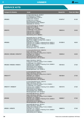 236INDEXPreise sind unverbindlich empfohlene VK-Preise.SCHRAUBENVERL%u00c4NGERUNGEN UND ADAPTERBeschreibungGr%u00f6sseL%u00e4nge (mm)Bestell-Nr.Preis inkl. MwstVerl%u00e4ngerung mit Stift \1/2\75B-5572823,00Verl%u00e4ngerung mit Stift \1/2\100134874-830,00Verl%u00e4ngerung mit Stift \1/2\150B-5571236,00Verl%u00e4ngerung mit Stift \1/2\250B-5570650,00Verl%u00e4ngerung mit Stift \3/4\150134997-296,00Gelenkst%u00fcck mit Stift \1/2\84134877-2122,00Gelenkst%u00fcck mit Stift \3/4\105134998-0183,00Adapter (f%u00fcr max. 350 Nm)1/2%u201c > 1/4%u201c Sechskant E-Formmit Stift \1/2\1/4\134873-060,00Adapter mit Schnellwechselfunktion(f%u00fcr max. 350 Nm)1/2%u201c > 1/4%u201c Sechskant E-Form mit Stift \1/2%u201c auf 1/4%u201cB-6844844,00Bitaufnahme 1/4%u201c Sechskant - Sperring3/8%u201c auf 1/4%u201cP-0596369,00SCHLAGSCHRAUBERGRIFFVERL%u00c4NGERUNG MIT SCHULTERGURTBeschreibungBestell-Nr.Preis inkl. MwstGriffverl%u00e4ngerung mit SchultergurtEinstellbare Gesamtl%u00e4nge : 657 - 807 mm191G67-2183,00F%u00fcr Schlagschrauber DTW700, DTW1001, DTW1002, TW001G, TW004G, TW007G, TW002G