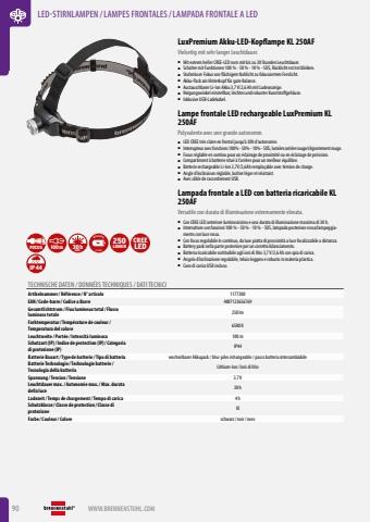 90 WWW.BRENNENSTUHL.COMLED-STIRNLAMPEN /LAMPES FRONTALES/LAMPADA FRONTALE A LEDLuxPremium Akku-LED-Kopflampe KL 250AFVielseitig mit sehr langer Leuchtdauer.%u25a0 Mit extrem heller CREE-LED vorn mit bis zu 30 Stunden Leuchtdauer.%u25a0 Schalter mit Funktionen 100 % - 50 % - 10 % - SOS, R%u00fccklicht rot/rot blinken.%u25a0 Stufenloser Fokus von fl%u00e4chigem Nahlicht zu fokussiertem Fernlicht.%u25a0 Akku-Pack am Hinterkopf f%u00fcr gute Balance.%u25a0 Austauschbarer Li-Ion Akku 3,7 V/2,6 Ah mit Ladeanzeige.%u25a0 Neigungswinkel einstellbar, leichtes und robustes Kunststoffgeh%u00e4use.%u25a0 Inklusive USB-Ladekabel.Lampe frontale LED rechargeable LuxPremium KL 250AFPolyvalente avec une grande autonomie.%u25a0 LED CREE tr%u00e8s claire en frontal jusqu%u2019%u00e0 30h d%u2019autonomie.%u25a0 Interrupteur avec fonctions 100% - 50% - 10% - SOS, lumi%u00e8re arri%u00e8re rouge/clignotement rouge.%u25a0 Focus r%u00e9glable en continu pour un %u00e9clairage de proximit%u00e9 ou en %u00e9clairage de pr%u00e9cision.%u25a0 Compartiment %u00e0 batterie situ%u00e9 %u00e0 l%u2019arri%u00e8re pour un meilleur %u00e9quilibre.%u25a0 Batterie rechargeable Li-Ion 3,7V/2,6Ah rempla%u00e7able avec t%u00e9mion de charge.%u25a0 Angle d%u2019inclinaison r%u00e9glable, bo%u00eetier l%u00e9ger et r%u00e9sistant.%u25a0 Avec c%u00e2ble de raccordement USB.Lampada frontale a LED con batteria ricaricabile KL 250AFVersatile con durata di illuminazione estremamente elevata.%u25a0 Con CREE LED anteriore luminosissimo e una durata di illuminazione massima di 30 h.%u25a0 Interruttore con funzioni 100 % - 50 % - 10 % - SOS, lampada posteriore rossa/lampeggiamento con luce rossa.%u25a0 Con focus regolabile in continuo, da luce piatta di prossimit%u00e0 a luce focalizzabile a distanza.%u25a0 Battery pack nella parte posteriore per un corretto bilanciamento.%u25a0 Batteria ricaricabile sostituibile agli ioni di litio 3,7 V/2,6 Ah con spia di carica.%u25a0 Angolo d%u2019inclinazione regolabile, telaio leggero e robusto in materia plastica.%u25a0 Cavo di carica USB incluso.FOCUS 100m MAX.30h Li-IonINCLUSIVE 250LUMENCREELEDIP44TECHNISCHE DATEN / DONN%u00c9ES TECHNIQUES / DATI TECNICIArtikelnummer/ R%u00e9f%u00e9rence / N%u00b0 articolo 1177300EAN/ Code-barre / Codice a Barre 4007123656769Gesamtlichtstrom/ Flux lumineux total/ Flusso luminoso totale 250 lmFarbtemperatur/ Temp%u00e9rature de couleur/ Temperatura del colore 6500 KLeuchtweite / Port%u00e9e / Intensit%u00e0 luminosa 100 mSchutzart (IP)/ Indice de protection (IP)/ Categoria di protezione (IP) IP44Batterie Bauart/ Type de batterie / Tipo di batteria wechselbarer Akkupack / bloc-piles %u00e9changeable / pacco batteria intercambiabileBatterie Technologie / Technologie batterie / Tecnologia della batteria Lithium-Ion / Ioni di litioSpannung / Tension / Tensione 3.7 VLeuchtdauer max./ Autonomie max./ Max. durata della luce 30 hLadezeit/ Temps de chargement/ Tempo di carica 4 hSchutzklasse / Classe de protection / Classe di protezione IIIFarbe / Couleur/ Colore schwarz/ noir/ nero