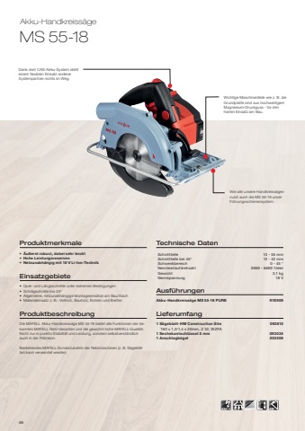30Akku-Kappschienen-S%u00e4geKSS 50 18M blProduktmerkmale%u2022 Bis 58 mm Schnitttiefe%u2022 Netzunabh%u00e4ngig mit 18 V CAS-LiHD-Technik%u2022 Pr%u00e4zise Winkel- und GehrungsschnitteEinsatzgebiete%u2022 Kappschnitte mit F%u00fchrungseinrichtung%u2022 L%u00e4ngs- und Querschnitte%u2022 Tauch- und Ausschnitte%u2022 Materialeinsatz z. B.: Plattenwerkstoffe, T%u00fcren, Arbeitsplatten, Parkett und Laminat, SchalungenProduktbeschreibungMit ihrem geringen Gewicht und Schnitttiefen von bis zu 52 mm auf der Schiene setzen die neuen, starken Kappschienen-S%u00e4gen von MAFELL deutliche Akzente zum Beispiel beim Innenausbau. Die S%u00e4ge wird nach dem Schnitt automatisch in die Ausgangsposition zur%u00fcckgezogen und bietet bei voller Schnitttiefe eine maximale Schnittl%u00e4ngevon 407 mm.Es ist kein Abschrauben des Spaltkeils mehr n%u00f6tig %u2013 der FLIPPKEIL bietet Ihnen beim Eintauchen optimalen Benutzerkomfort und Anwendersicherheit.Technische Daten KSS 50 18M bl Schnitttiefe mit Schiene bei 0%u00b0 0 %u2013 52 mmSchnitttiefe mit Schiene bei 45%u00b0 0 %u2013 42 mmSchnitttiefe ohne Schiene bei 0%u00b0 0 %u2013 58 mmSchnitttiefe ohne Schiene bei 45%u00b0 0 %u2013 48 mmSchwenkbereich 0 %u2013 45 %u00b0Schnittl%u00e4nge 407 mmWinkelschnitte %u2013 60%u00b0 %u2013 + 60 %u00b0Nennleerlaufdrehzahl 4450 1/minAbsauganschluss %u00d8 35 mmGewicht mit Schiene 5,7 kgAkku 18 V, 99 Wh, LiHDAusf%u00fchrungenAkku-Kappschienen-S%u00e4ge KSS 50 18M bl PURE im Transportkoffer 91B602Akku-Kappschienen-S%u00e4ge KSS 50 18M bl im Transportkoffer 91B601Lieferumfang1 S%u00e4geblatt-HM 092480 168 x 1,2/1,8 x 20 mm, Z 32, WZ,f%u00fcr Feinschnitte in Holz2 Akku-PowerTank 18 M 99 LiHD (nur bei 91B601) 094503 18 V, 99 Wh, LiHD 1 Akku-PowerStation APS M (nur bei 91B601) 0944921 F%u00fchrungseinrichtung M 208170max. Schnittl%u00e4nge 400 mm1 Sechskantschl%u00fcssel 5 mm 0930341 Sp%u00e4nebeutel 206921PG APreisliste Seite 4Flexibel wie noch nie %u2013 die Kappschienen-S%u00e4ge mit neuster 18 V Lithium-Ionen-Technik erm%u00f6glicht professionellen Einsatz fernab jeder Steckdose.Mit einem einzigen Knopfdruck l%u00e4sst sich die Maschine von der Kappschiene l%u00f6sen und mit allen Anwendungsm%u00f6glichkeiten der K 55 cc verwenden.Helle LED-Lichter sorgen f%u00fcr eine gro%u00dffl%u00e4chige Ausleuchtung des Arbeitsbereichs.