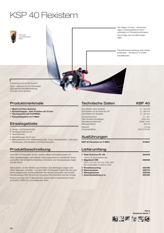 32Kappschienen-S%u00e4geKSS 60 ccProduktmerkmale%u2022 Mit CUprex Hochleistungsmotor%u2022 Tauchsystem mit FLIPPKEILEinsatzgebiete%u2022 Kappschnitte mit F%u00fchrungseinrichtung%u2022 L%u00e4ngs- und Querschnitte%u2022 Tauch- und Ausschnitte%u2022 Materialeinsatz z. B.: Vollholz, Plattenwerkstoffe, D%u00e4mmstoff, T%u00fcren,  Arbeitsplatten, Innenausbau und RenovierungenProduktbeschreibungMit ihrem geringen Gewicht und Schnitttiefen von bis zu 60 mm auf der Schiene setzen die neuen, starken Kappschienen-S%u00e4gen von MAFELL deutliche Akzente zum Beispiel beim Innenausbau. Die S%u00e4ge wird nach dem Schnitt automatisch in die Ausgangsposition zur%u00fcckgezogen und bietet bei voller Schnitttiefe eine maximale Schnittl%u00e4ngevon 408 mm.Geballte Power und hohe Drehmomente haben einen Namen: CUprex der Hochleistungsmotor mit leistungsoptimierter Digital-Elektronik und neu entwickelter Steuertechnik. Dabei kann die Drehzahl stufenlos auf unterschiedliche Materialien und Anwendungen eingestellt werden.Es ist kein Abschrauben des Spaltkeils mehr n%u00f6tig %u2013 der FLIPPKEIL bietet Ihnen beim Eintauchen optimalen Benutzerkomfort und Anwendersicherheit.Technische Daten KSS 60 cc Schnitttiefe mit Schiene bei 0%u00b0 0 %u2013 61 mmSchnitttiefe mit Schiene bei 45%u00b0 0 %u2013 47 mmSchnitttiefe ohne Schiene bei 0%u00b0 0 %u2013 67 mmSchnitttiefe ohne Schiene bei 45 0 %u2013 53 mmSchwenkbereich 0 %u2013 45%u00b0Schnittl%u00e4nge 408 mmWinkelschnitte %u2013 60%u00b0 %u2013 + 60%u00b0Nennleerlaufdrehzahl 2700 %u2013 4700 1/minNennaufnahme 1800 WGewicht mit Schiene 6,1 kgUniversal-Motor 230 V / 50 HzAusf%u00fchrungenKappschienen-S%u00e4ge KSS 60 cc 91B101Kappschienen-S%u00e4ge KSS 60 cc im Transportkoffer 91B102Lieferumfang1 S%u00e4geblatt-HM 092489 185 x 1,4/2,4 x 20 mm, Z 32, WZ,  f%u00fcr Feinschnitte in Holz1 Parallelanschlag 1 Sechskantschl%u00fcssel 5 mm 0930341 F%u00fchrungseinrichtung M 208170max. Schnittl%u00e4nge 400 mm1 Anschlussleitung 4 mPG APreisliste Seite 5Die gummierte Unterseite h%u00e4lt die Kappschienen-S%u00e4ge sicher auf dem Material und sch%u00fctzt die Werkst%u00fcck-Oberfl%u00e4che vor Besch%u00e4digungen.Mit einem einzigen Knopfdruck l%u00e4sst sich die Maschine von der Kappschiene l%u00f6sen und mit allen Anwendungsm%u00f6glichkeiten der K 65 cc verwenden.Durch das einzigartige Schwenksystem ist im Winkelbereich zwischen 0%u00b0 und 45%u00b0 immer eine Schnitttiefe von 47 mm (inkl. Schiene) erreichbar.