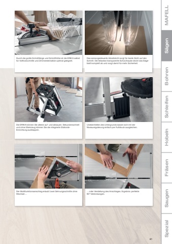 33MAFELLS%u00e4genSchleifenHobelnFr%u00e4senSaugenSpezialBohrenSonderzubeh%u00f6r/WerkzeugeAlles aus einer Hand: Bei der KappschienenS%u00e4ge sind Maschine und F%u00fchrungsschiene fest miteinander verbunden. Durch die gro%u00dfe Skaleneinteilung ist die Winkeleinstellung extrem pr%u00e4zise. Der fixe und der einstellbare Anschlag an der Unterseite der Schiene sorgen daf%u00fcr, dass das System f%u00fcr Winkelschnitte von + 60%u00b0 bis - 60%u00b0 eingesetzt werden kann.Dank gro%u00dfdimensionierter Winkelskala und pr%u00e4ziser Doppelklemmung lassen sich Gehrungsschnitte passgenau umsetzen.AbbildungBezeichnungBest. Nr.F%u00fchrungsschienenF 80, 0,8 m langF 110, 1,1 m langF 160, 1,6 m langF 210, 2,1 m langF 310, 3,1 m lang204380204381204365204382204383Verbindungsst%u00fcck F-VSzum Verbinden zweier F%u00fchrungsschienen204363Winkelanschlag F-WA205357Saug-Spann-System Aerofix F-AF 1mit 1,3 m Schiene, Adapter f%u00fcr oben und unten, Flexschlauch204770Flexschlauch FXS-Lbis L%u00e4nge 3,2 m205276F%u00fchrungsschienentasche F 160f%u00fcr F%u00fchrungsschienen bis 1,6 m L%u00e4ngeF%u00fchrungsschienen -taschen-Set:2 x F 160 + F-VS + 2 x F-SZ 180MM+ F%u00fchrungsschienentascheF%u00fchrungsschienentaschen-Set:F 80 + F 160 + F-WA + F-VS + 2 x F-SZ 180 MM+ F%u00fchrungsschienentasche204626209591209592Endkappen F-EK2 St%u00fcck205400Haftprofil F-HP 6,8M6,8 m lang204376Spanrei%u00dfschutz F-SS 3,4M3,4 m lang204375Spannzwinge F-SZ 180MM2 St%u00fcck, zur Schienenfixierung am Werkst%u00fcck207770AbbildungBezeichnungBest. Nr.F%u00fchrungseinrichtung Mmaximale Schnittl%u00e4nge 400 mmF%u00fchrungseinrichtung MLmaximale Schnittl%u00e4nge 770 mm208170204378Untergreifanschlag MF-UA206073S%u00e4geblatt-HM185 x 1,4 / 2,4 x 20 mm, Z 16, WZ, f%u00fcr L%u00e4ngsschnitte in HolzS%u00e4geblatt-HM185 x 1,4 / 2,4 x 20 mm, Z 24, WZ, f%u00fcr universellen Einsatz in Holz092485092487S%u00e4geblatt-HM185 x 1,4 / 2,4 x 20 mm, Z 32, WZ, f%u00fcr Feinschnitte in HolzS%u00e4geblatt-HM185 x 1,4 / 2,4 x 20 mm, Z 56, WZ, f%u00fcr Querschnitte in Holz092489092491Sp%u00e4nebeutel206921
