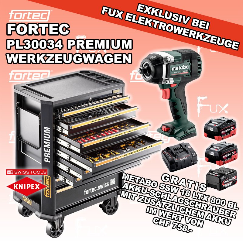 Heute auf dieses Produkt 34% Rabatt! Zu "Werkzeugwagen" von fortec Werkzeuge Sparfux Aktionen FUX SPECIAL EXKLUSIV BEI FUX fortec Werkzeuge PL30034 Premium Werkstattwagen 706 - tlg. Bestell- und Artikelnummer: PL30034 SSW GRATIS Metabo SSW 18 LTX 800 BL Akku-Schlagschrauber mit zusätzlichem Akku im Wert von CHF 758.- Wenn Sie keine Kompromisse eingehen und nur das Beste wollen, ist unser PREMIUM Werkstattwagen genau das Richtige. Bestückt mit 706 Werkzeugen, PB-Swiss Tools Schraubendrehern, Zangen von Knipex, plus fortec Drehmomentschlüssel mit 4 St. passenden Schlagschrauberstecknüssen. Montiert mit Standard Rollen (hart) Zusätzlich im Lieferumfang 4 St.Lenk-Bockrollen «Silent» (weich) Baugleich wie Technocraft Swiss-Team Plus+ Pro Werkstattwagen ( 665206 / 7611269029041 ) Technische Daten Abmessungen 775 x 530 x 1035 mm Gewicht 114 kg Listenpreis CHF 3'348.00 Fuxpreis CHF 2'206.00 inkl. 8.1% MwSt Versand CHF 75.00 Kein Grauimport! Produkt bestellen 1 Stück 2 Stück 3 Stück 4 Stück 5 Stück 6 Stück 7 Stück 8 Stück 9 Stück 10 Stück Alle Angaben ohne Gewähr und solange Vorrat reicht! Produkt als PDF AKTION 34%