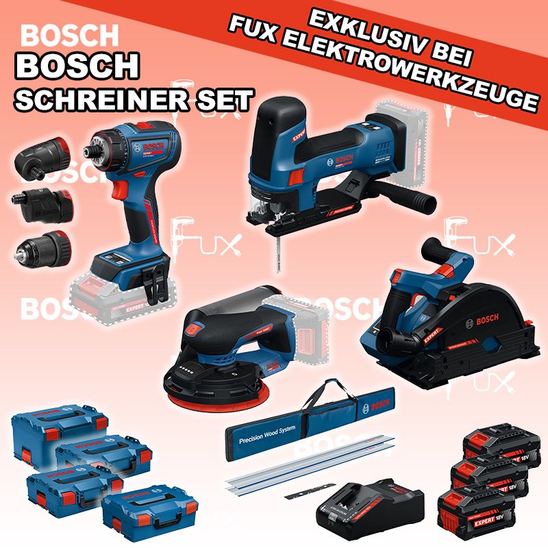 Das Ladenlokal bleibt vom 23. Februar 2026 bis am 28. Februar 2026 geschlossen. Bestellungen und Lieferungen von Neugeräten werden trotz Ferienabwesenheit in gewohnter Fux-Manier entgegengenommen und ausgeliefert. Zu "Schreiner Set" von Bosch Professional FUX SPECIAL EXKLUSIV BEI FUX Bosch Expert EXSchreiner Set 4 Bestell- und Artikelnummer: Bosch Schreiner Set 4 5 Jahre Garantie auf Bosch Expert Maschinen EXST18V-155S Akku-StichsägeAkkuspannung 18 V Hubzahl bei Leerlauf 800 - 3800 min⁻¹ Hubhöhe 26 mm Gewicht exkl. Akku 1.9 kgInfos EXSR18V-90FC Akku-BohrschrauberAkkuspannung 18 V Drehmoment 36 / 65 / - Nm Leerlaufdrehzahl 0 – 630 / 0 – 2100 min⁻¹ Gewicht exkl. Akku 0.92 kgInfos EXKT18V-52G Akku-TauchsägeAkkuspannung 18 V Leerlaufdrehzahl 2800 – 5500 min⁻¹ Gewicht exkl. Akku 4.1 kgInfos EXEX18V-150-5 Akku-ExzenterschleiferAkkuspannung 18 V Schleifteller-Ø 150 mm Leerlaufdrehzahl 5000 – 10000 Umin Schwingzahl 10000 – 20000 min⁻¹ Gewicht exkl. Akku 1.2 kgInfos FSN 1400 Set Führungsschienensysteme Systemzubehör2 x Führungsschiene FSN 1400 Verbindungsstück FSN VEL Tasche FSN BAGInfos 3x EXBA18V-80 + EXAL18V-160 Starter-Set3 x EXBA18V-80 Akkupack EXAL18V-160 LadegerätInfos Standard-Ausrüstung In diesem Set enthalten: EXST18V-155S Akku-Stichsäge EXSR18V-90FC Akku-Bohrschrauber EXKT18V-52G Akku-Tauchsäge EXEX18V-150-5 Akku-Exzenterschleifer FSN 1400 Set Führungsschienensysteme Systemzubehör 3x EXBA18V-80 + EXAL18V-160 Starter-Set Geliefert im Koffer Zubehör Listenpreis CHF 2'606.90 Fuxpreis CHF 2'019.00 inklusive 8.1% MwSt Kostenloser Versand Kein Grauimport! Produkt bestellen Das Produkt ist momentan nicht lieferbar!Bestätigen sie, dass sie damit einverstanden sind! 1 Stück 2 Stück 3 Stück 4 Stück 5 Stück 6 Stück 7 Stück 8 Stück 9 Stück 10 Stück Alle Angaben ohne Gewähr und solange Vorrat reicht! Produkt als PDF NEUHEITAKTION 22%