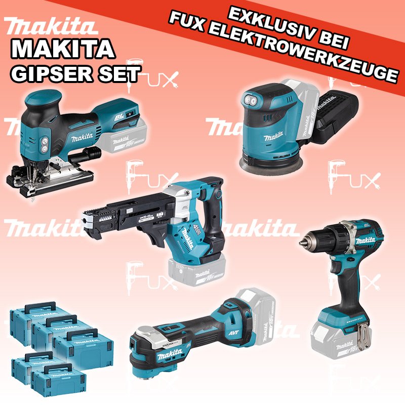 Makita Gipser Set 2 SOLO DDF484ZJ Akku-Bohrschrauber DFR552Z Akku-Magazinschrauber DBO180ZJ Akku-Exzenterschleifer DTM52Z Multifunktions Werkzeug DJV18ZJ Akku-Stichsäge MAKPAC Gr. 3 Einsatz für DFR551 Einsatz für DTM52