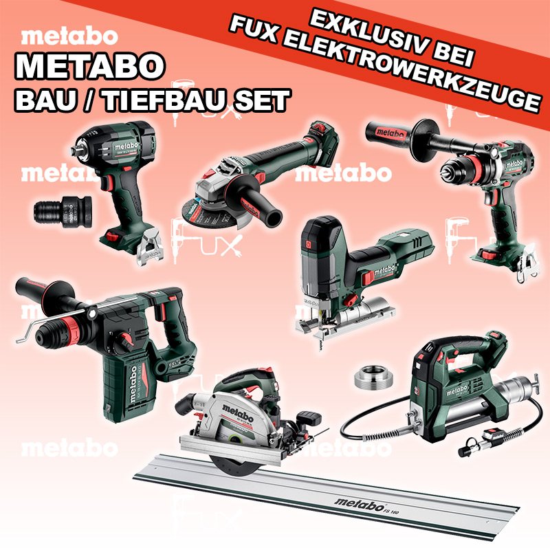 Metabo Bau / Tiefbau Set  8 SOLO BS 18 LTX BL Q I Akku-Bohrschrauber ST 18 LT 130 BL  Akku-Stichsäge KH 18 LTX BL 24 Q Akku-Kombihammer WVB 18 LT BL 11-125 Quick Akku-Winkelschleifer SSW 18 LTX 550 BL Akku-Schlagschrauber FP 18 LTX Akku Fettpresse KS 18 LTX 66 BL Akku Handkreissäge FS 160 Führungsschiene Adapter für Lube-Shuttle® 400G Adapter mit 1/2“ auf 1/4"